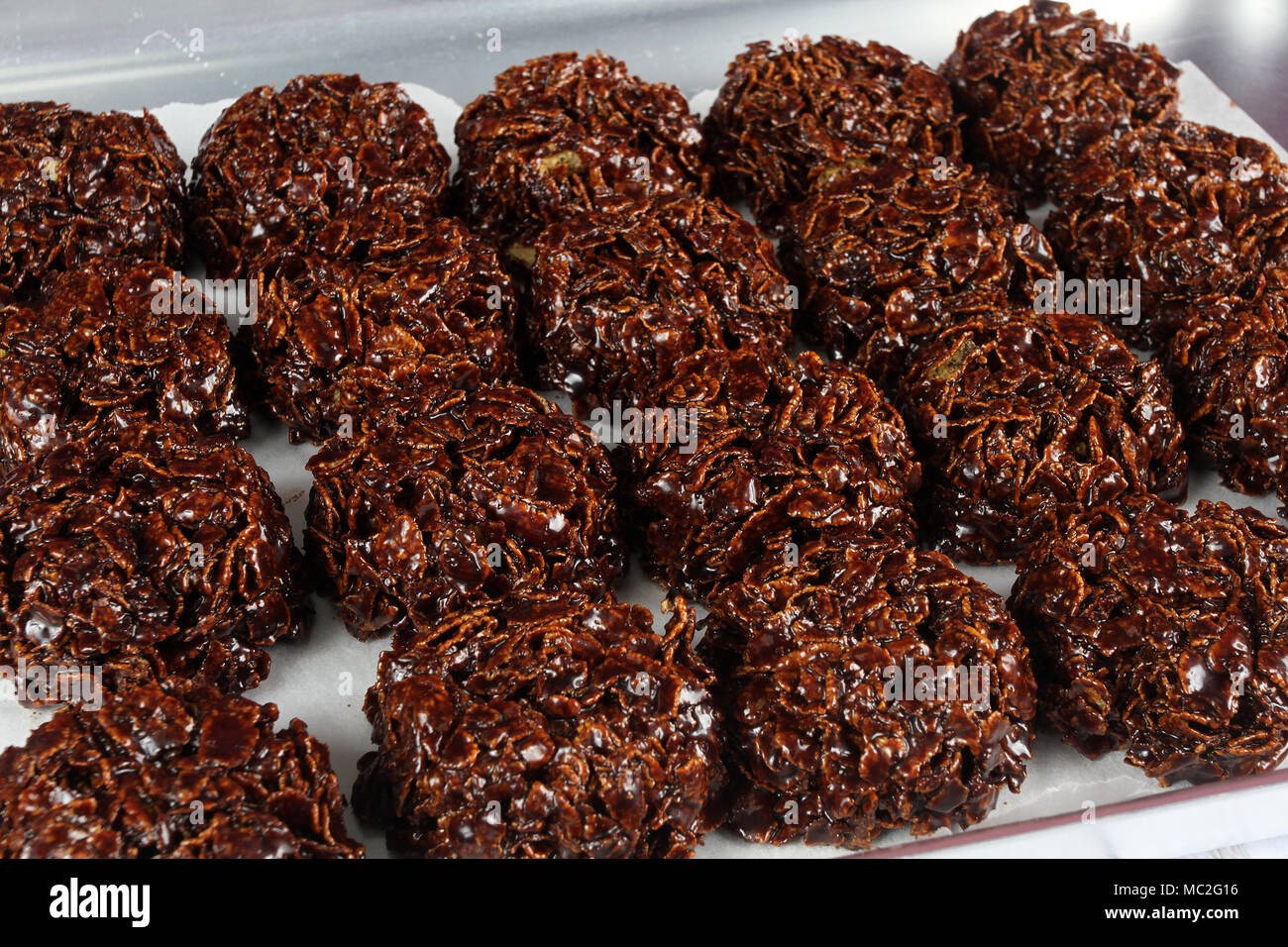 Instructions to make Chocolate cracknell cakes. Weigh the cornflakes in a large bowl. Grease a round tin 2.